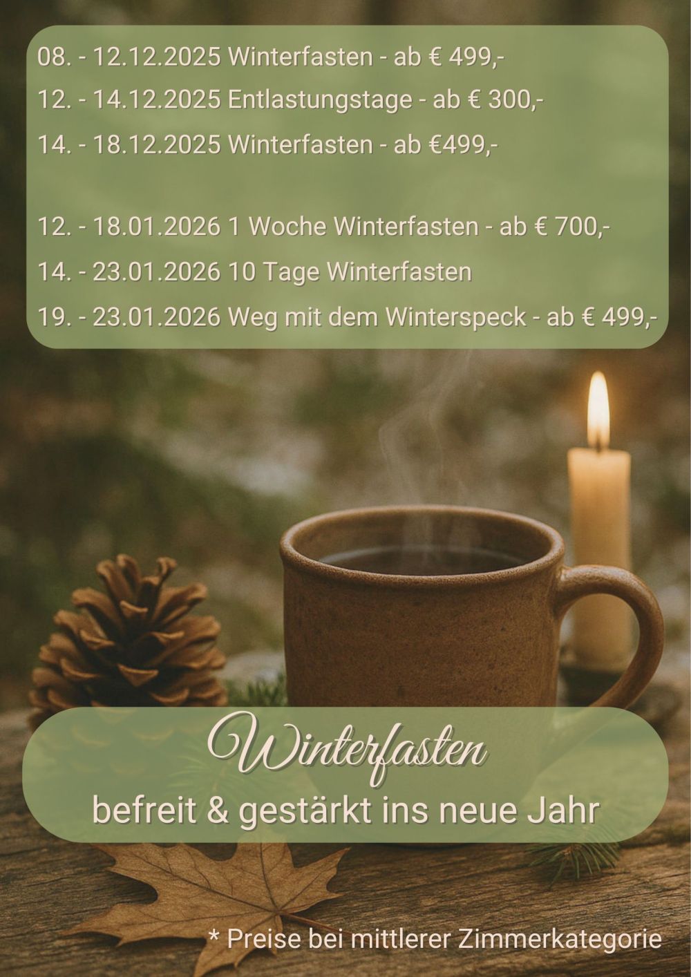 Unsere Winterfasten-Termine bieten die ideale Gelegenheit, um in der Zeit zwischen den Jahren, innerlich und äußerlich Altes loszulassen und Energie fürs Neue zu sammeln: